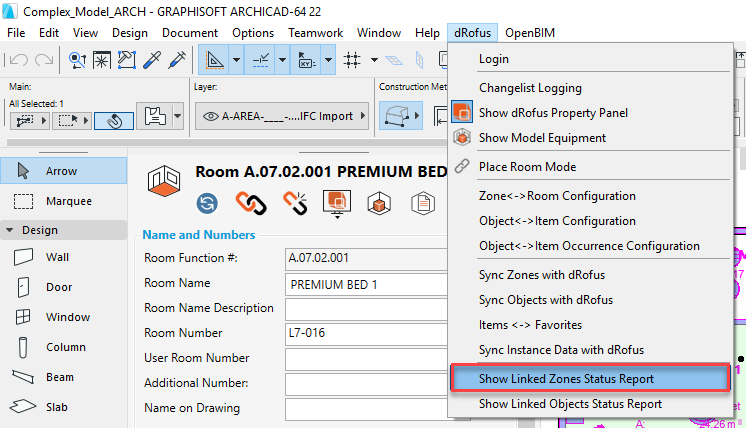 To access the Link Status dialog (which provides a detailed overview of dRofus Rooms, ArchiCAD Zones and their linked status) select Show Linked Zones Status Report within the dRofus Menu: