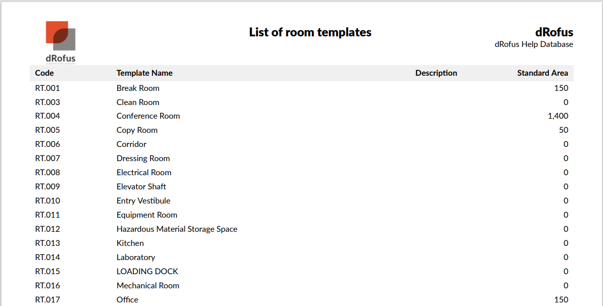 This report lists all room templates with code, name, and recommended programmed area by default, but any available field in room templates can be added.