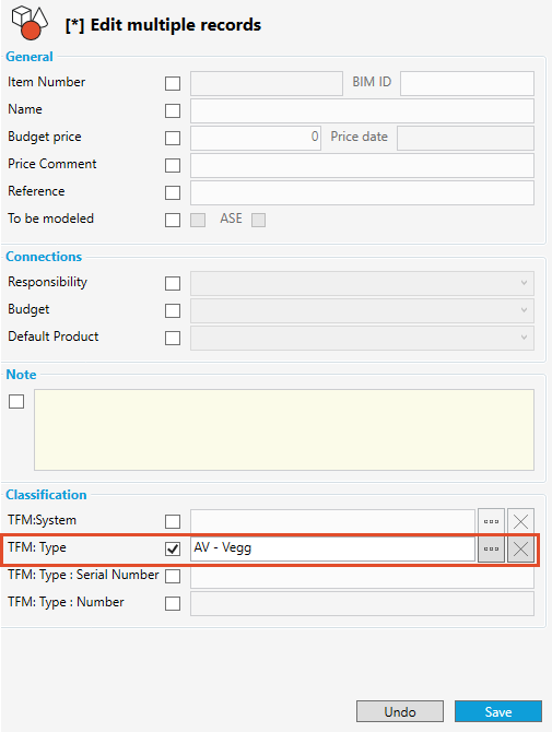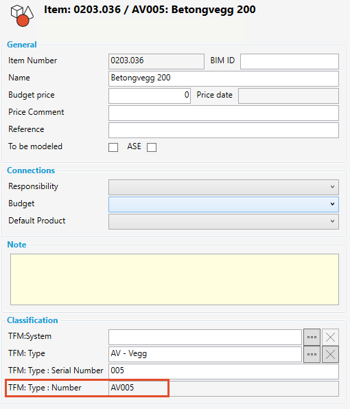 Merknad: Noen prosjekter velger å bruke artikkelgruppestrukturen til å sette TFM type kode til forekomster og ikke klassifiseringsfunksjonen. dRofus bruk automatisk artikkelgruppenummeret til å opprette typekode dersom artikkelen ikke er typeklassisert
