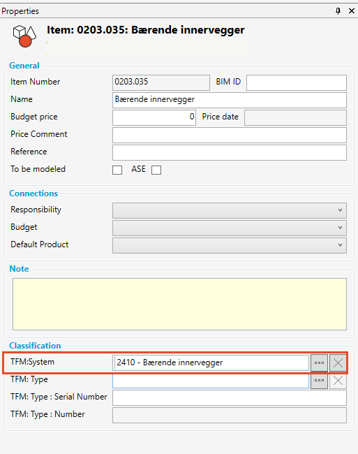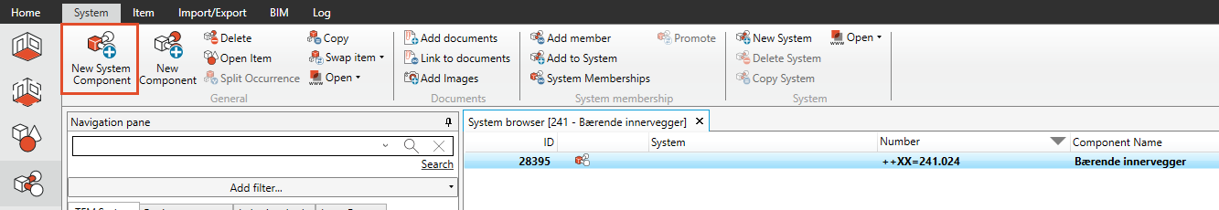 Artikkel “bærende innervegger” skal fungere som en “system komponent”. For at den skal fungere som en systemkomponent legger vi til TFM Systemkode.
