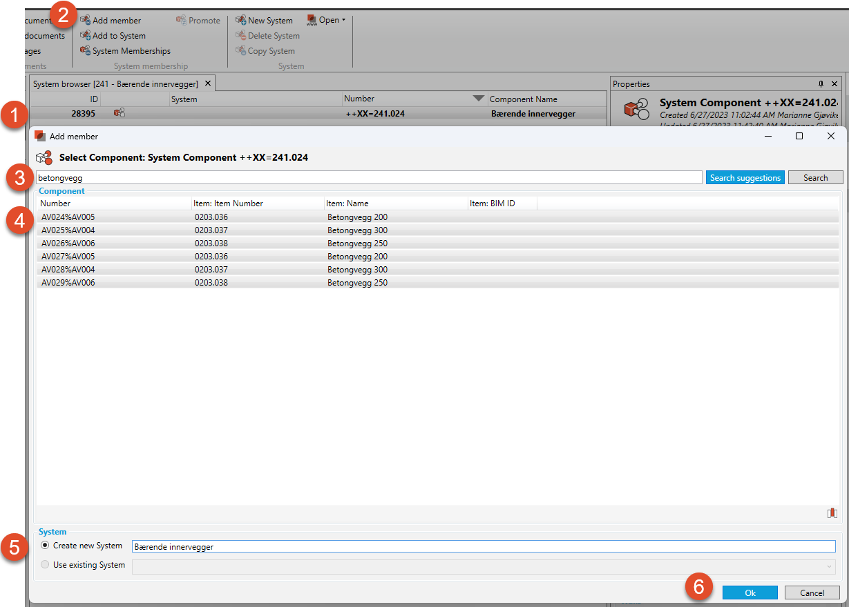 Velg systemkomponent. I eksemplet over “bærende innervegg”