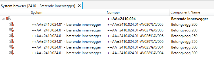En systemkomponent er i dRofus en forekomst av en artikkel. Forekomster av artikler som er systemklassifisert med TFM- System, vil automatisk bli lagt til som systemkomponent i system modulen. I dette tilfellet en forekomst av artikkelen “bærende innervegg”.