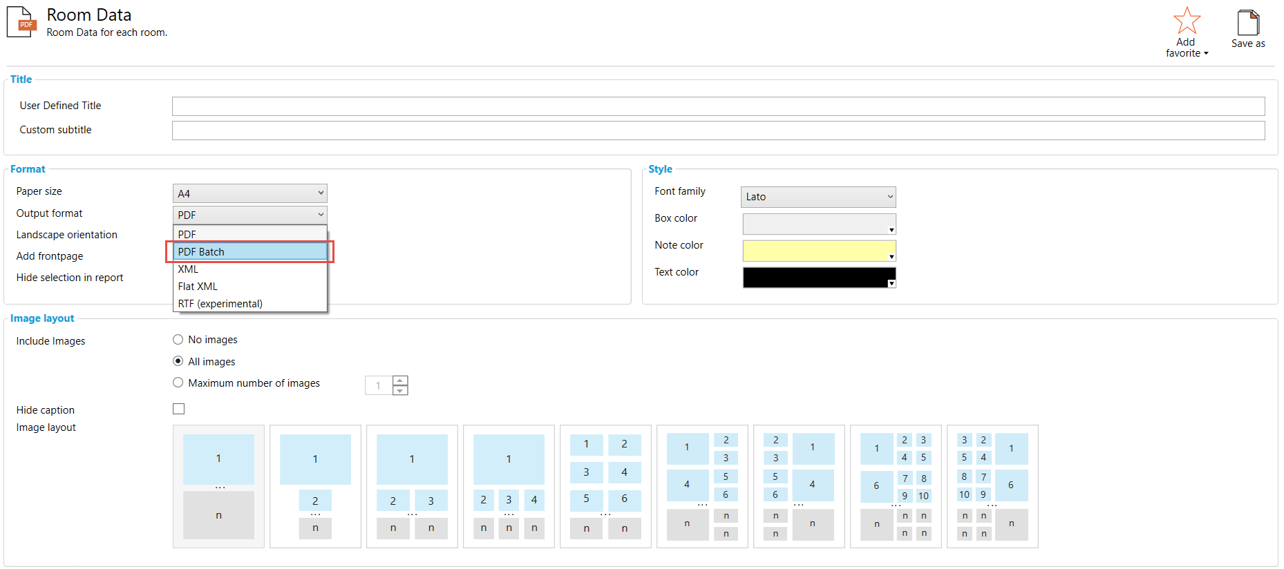 PDF batch reporting allows you to create individual reports for each entity you report. An entity can be a room, room template, template, Item or material. Say you want to create one PDF report for each room in a room function. You select the Room Data Sheet report, select the room function and then change the output format from PDF to PDF Batch in More options;