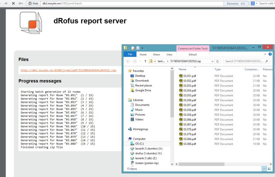When the PDF Batch report is started, a web page showing you the progress will be shown in your default browser. All the individual PDF files will be created on the server and added to a zip file. The zip file will be automatically opened when the report is finished.