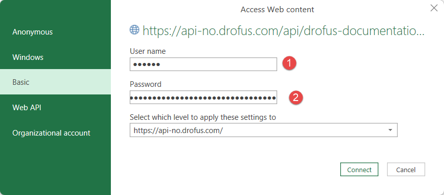 The first time you connect to a data-source from Excel you will be asked how to connect and insert your credentials;