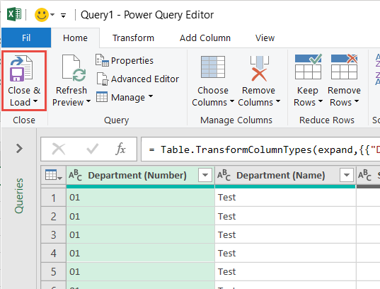 After the query has been processed you will see the columns have been set up in Excel. Chose Close and Load to load the data into your Excel spreadsheet.