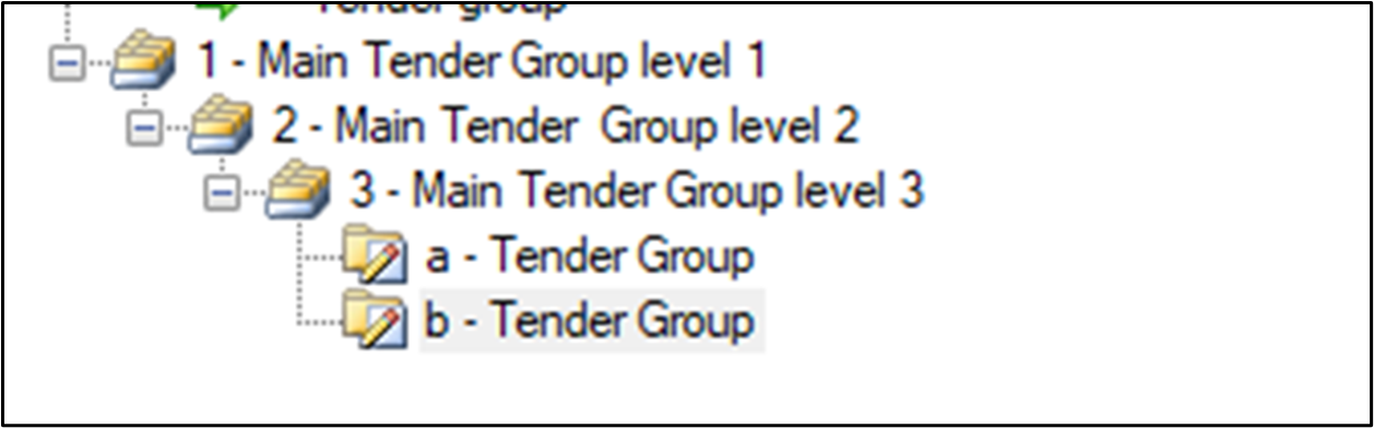 Tender Group is a collection of Items, that one or sevarel suppliers will be asked to provide. Items are linked to tender groups (not main groups). If a tender group has sub-groups, the item must be linked to the lowes level of the sub-group.