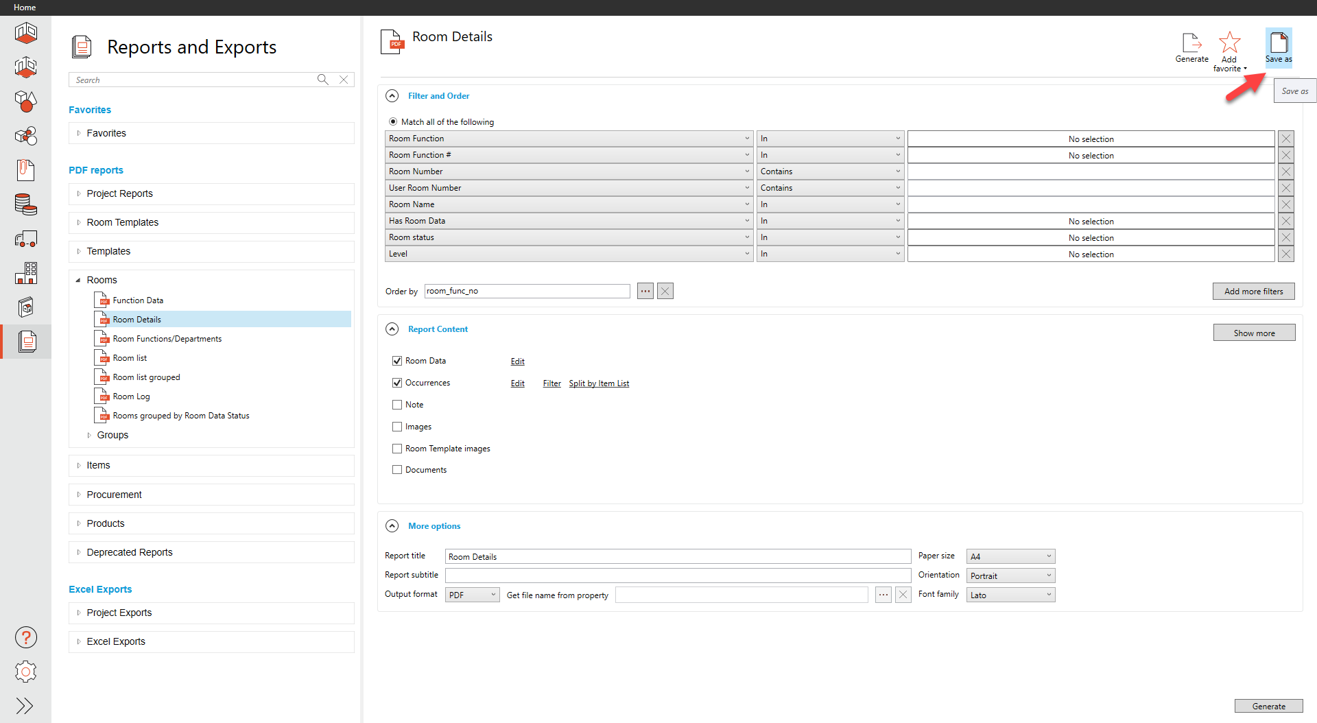 You can save your frequently used PDF reports as a new project report. After setting your desired limitation and expansions to the report, you can choose to save the report by clicking "Save as" in the top right corner of the report option window.