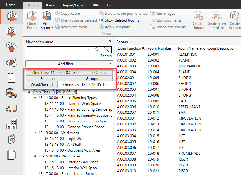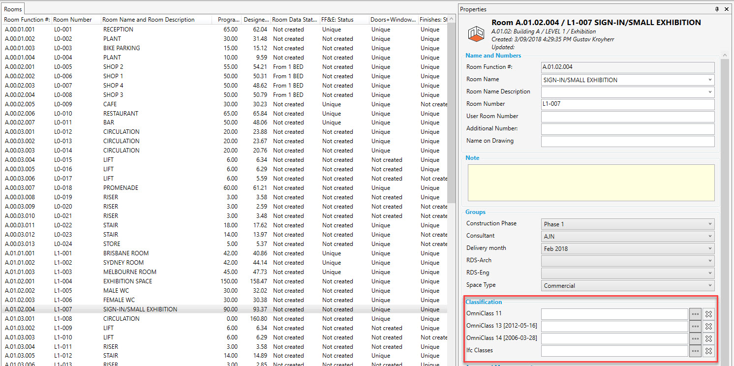 One or more Classification systems (such as OmniClass, Masterformat, Uniclass or Ifc) can be assigned to Rooms independently of their Functional Location.