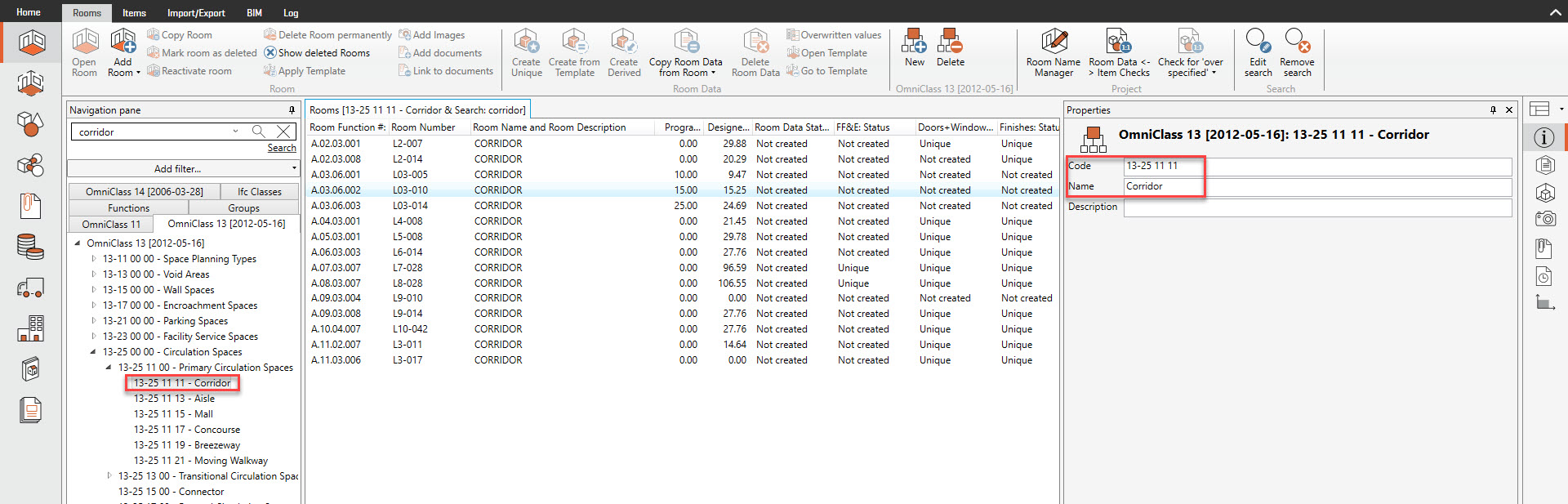 Classifications can be applied as filters in Reporting. For example you might want to run a Room Data Report for all OmniClass 13-25 11 11 - Primary Circulation Spaces.