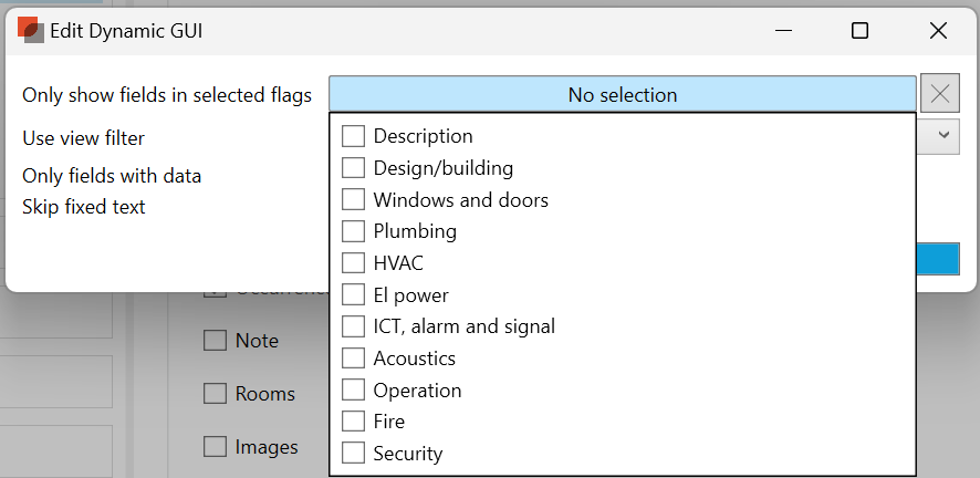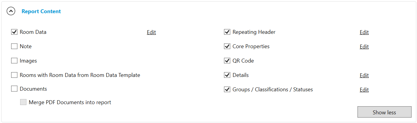 Room Data, by default, has no filters for flags or view filters. By default, show all data fields regardless if they have data and will include fixed text. These choices can be modified by selecting Edit next to this content section.