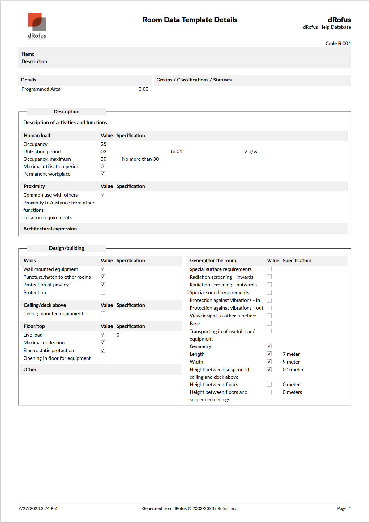 Room Data Templates Details PDF Report