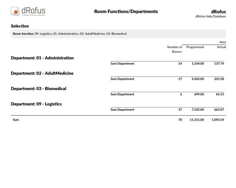 The Room Functions/Departments report below, was filtered to only show Functions 01, 02, 03, and 09. Area Sums have been included in the Report.