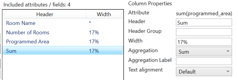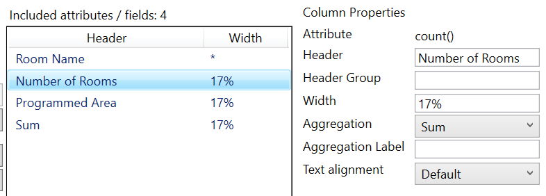 We show four columns with the following column widths: Room Name (*), Number of Rooms (17%), Programmed Area (17%), and Sum (17%), which can be adjusted to include any room fields. The asterisk * denotes no width defined and is what is left over, making up 100% after using the columns defined with a width.