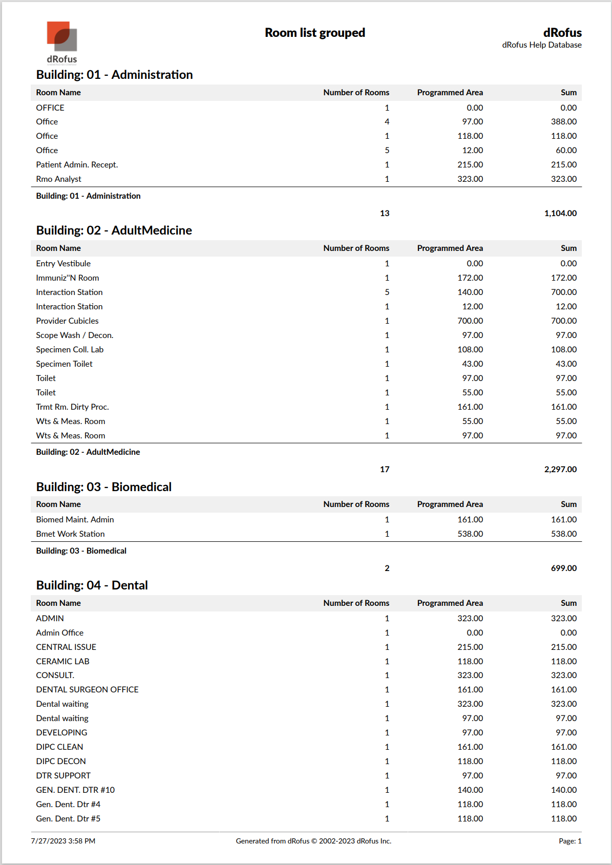 This report lists all rooms grouped based on matching Name and Programmed Area with Room Name, Number or Rooms, Programmed Area, and Sum by default, but any available field in rooms can be added.