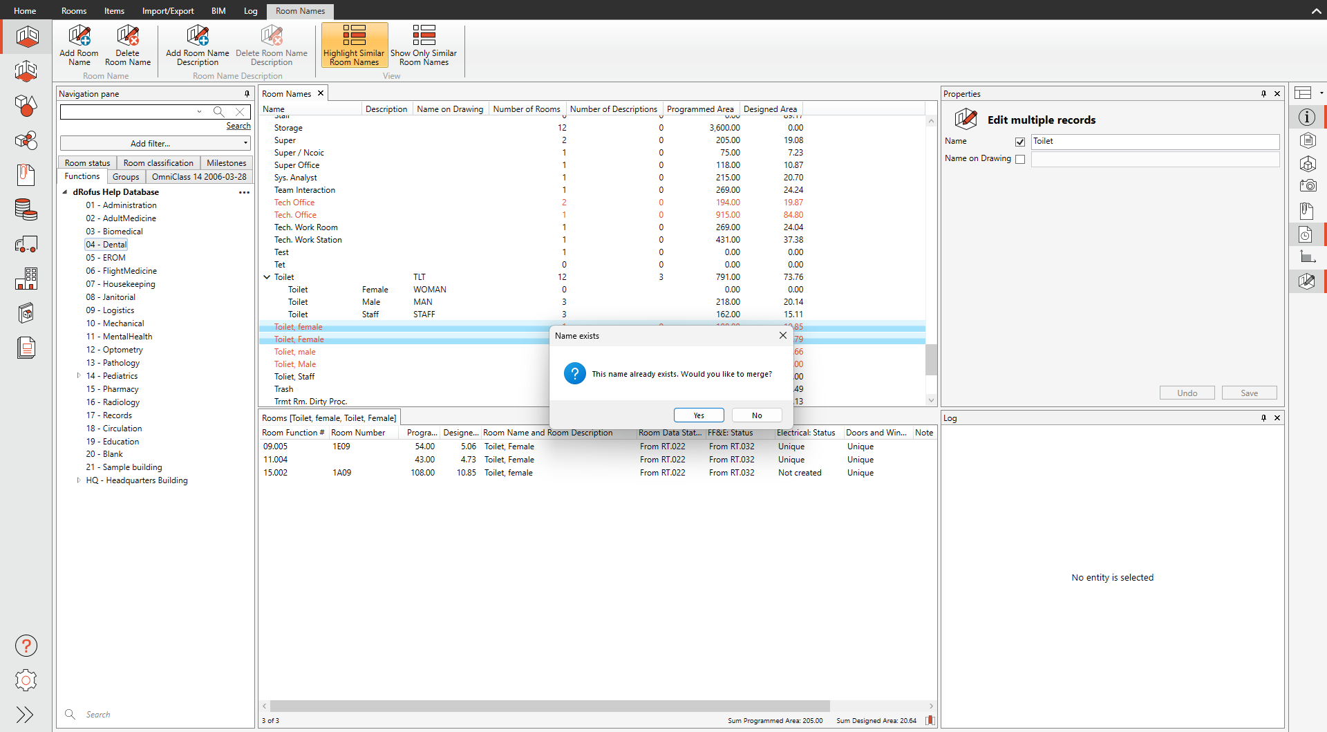 To merge similar room names into the same Room Name, start by selecting all similar rooms. Then, check the box next to the Name field in the properties and populate it with the new Name.