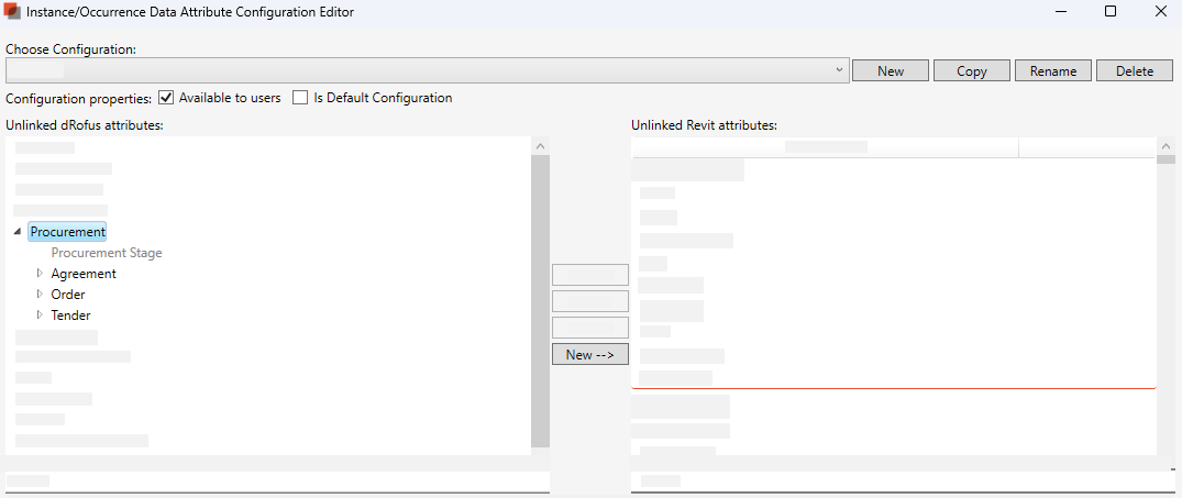 Attributes regarding, Agreement, order and Tender, can be found under “Procurement”. This data can only be sent from dRofus Occurrence to Revit Instance.