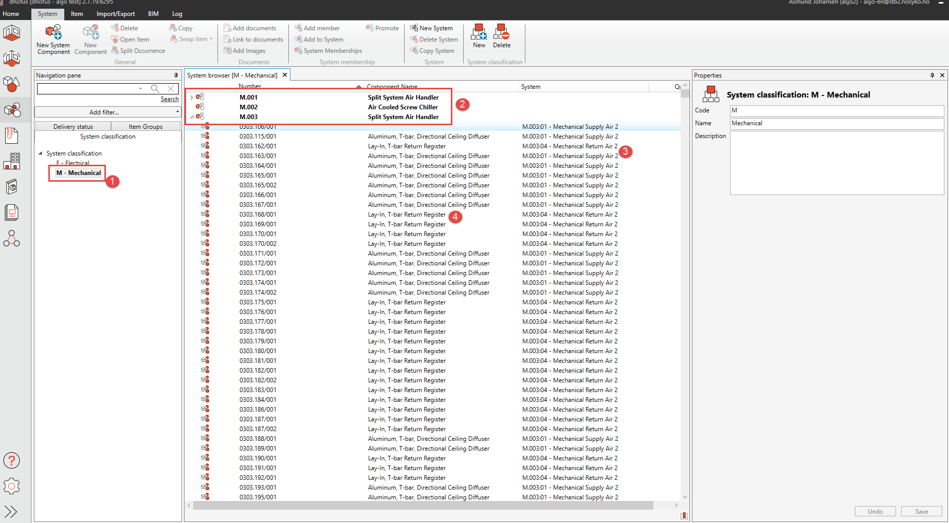 In the image below, we can see the result of the importation of occurrences and systems. Prior to the occurrences import we classified three Items as M - Mechanical. The result is three system components, M.001 - M.002, with systems and components in the system browser hierarchy.