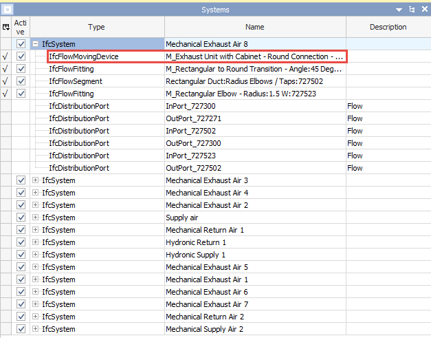 In the above image, we have 14 systems in total. The first system (“Mechanical Exhaust Air 8”) is expanded so we can see all its members. When importing the first system, the first member (“M_Exhaust Unit with Cabinet—...” highlighted in red) will be promoted as a system component in dRofus. The same logic will be applied to all 14 systems.