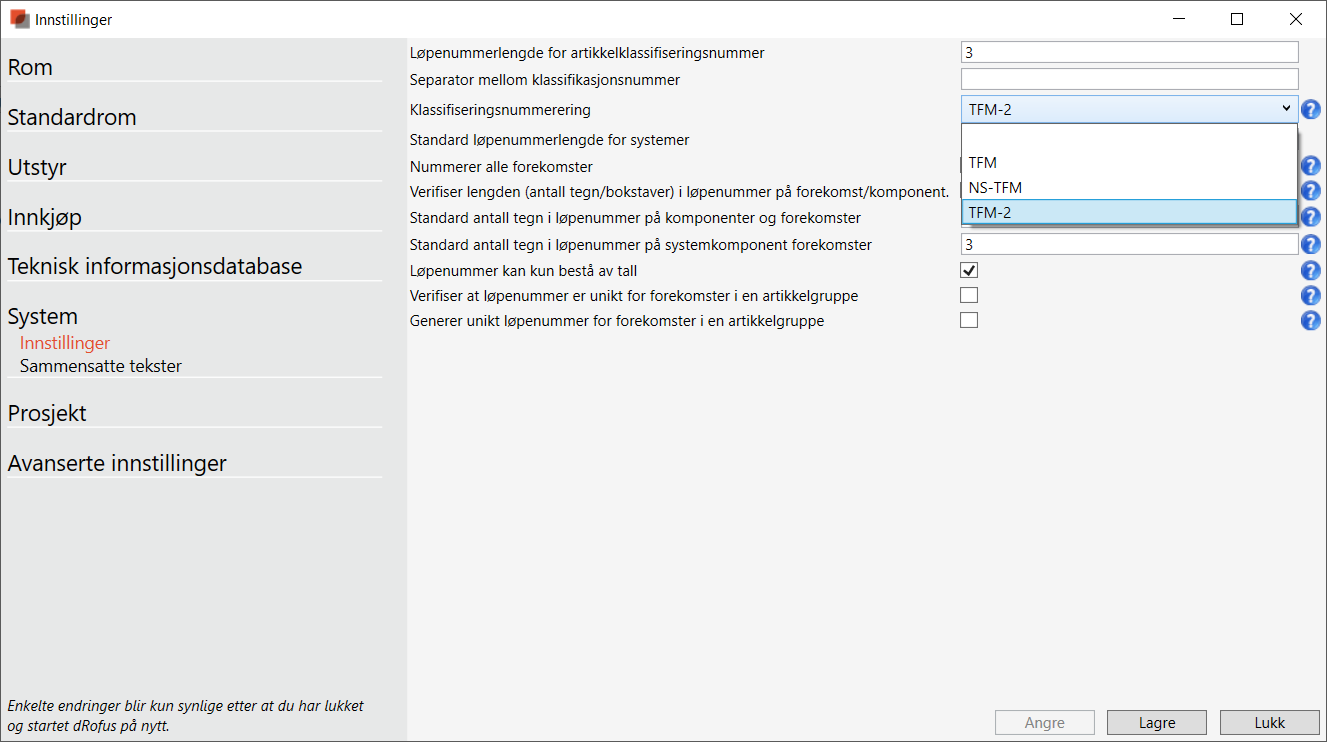 Under innstillinger må man sette hvilke nummereringsregler som skal benyttes. Her kan man velge mellom TFM, TFM-2 eller NS-TFM. I denne guiden baserer vi oss på TFM-2.