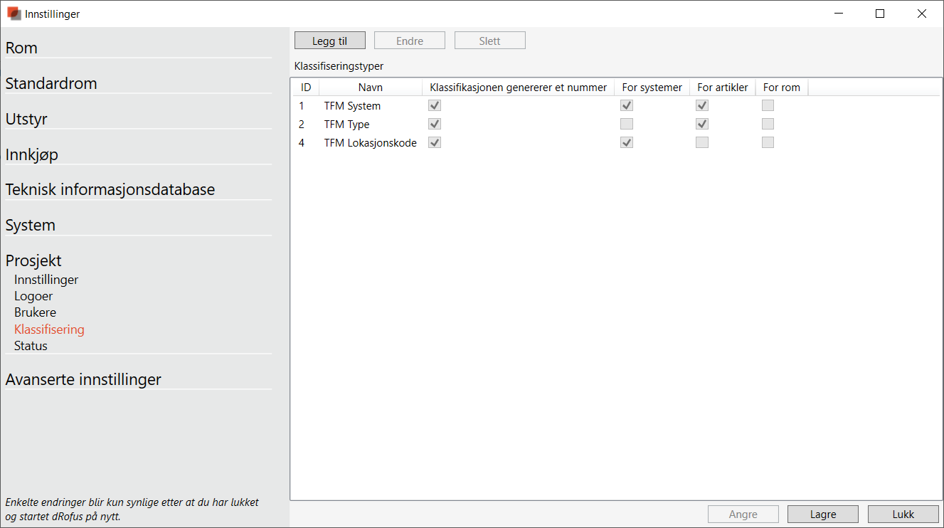 Legg merke til at klassifikasjonen «TFM: system» er både artikkelklassifisering og systemklassifisering. Dette fordi man ønsker å kunne sette systemnummer på systemkomponenter som ventilasjonsaggregat, elektrofordelinger mv.