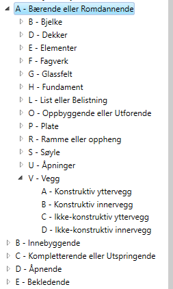 Noen prosjekter velger å strukturere artikkelgruppene likt som typekoden i NS 3457-8:2021. Fult artikkelgruppe navn brukes videre til TFM-type klassifisering. Se Eksempel på artikkelstruktur: