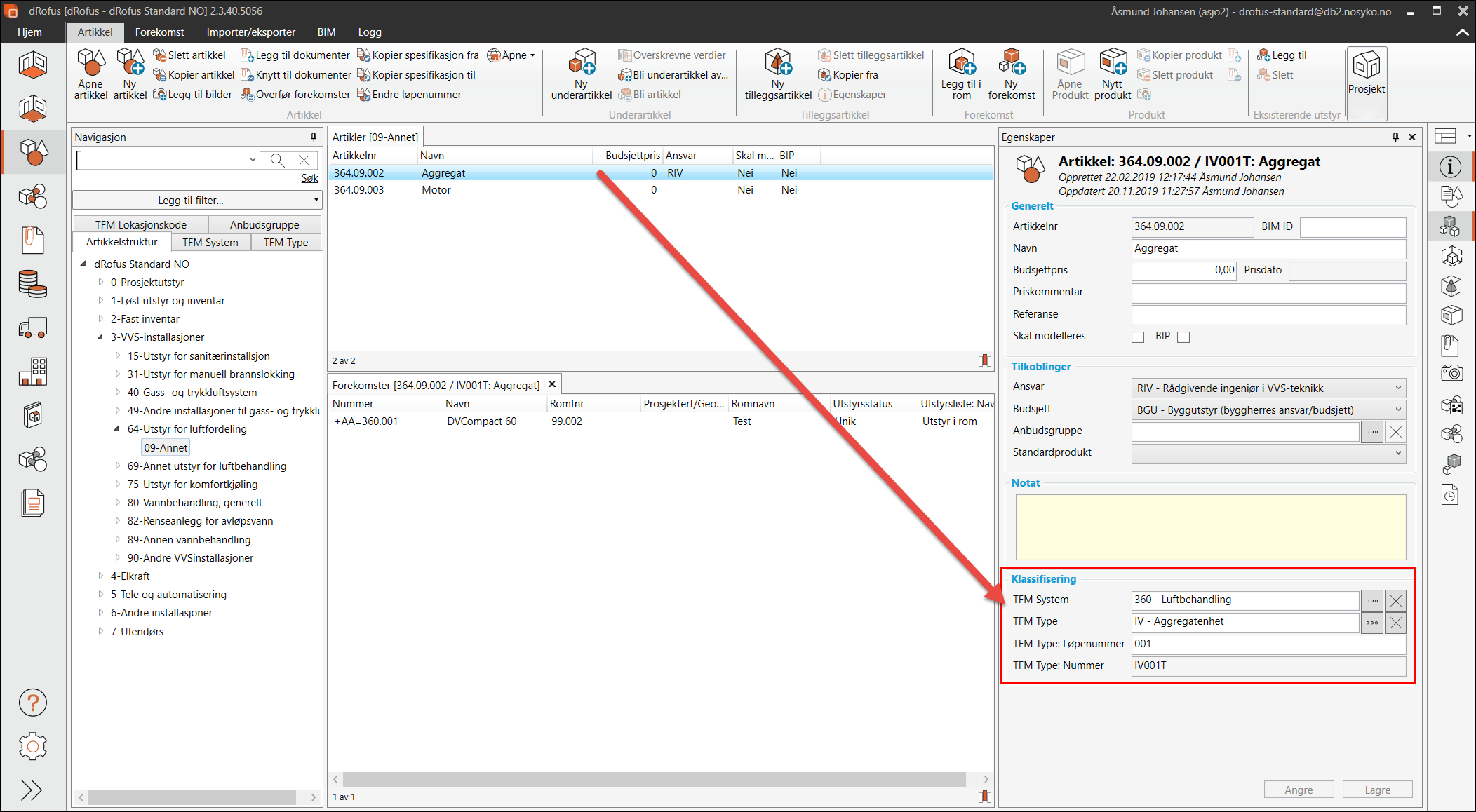 Når det er satt både type og systemklassifikasjon på en artikkel vil type klassifikasjonen ligge på artikkel (IV001T i eksemplet over), mens forekomster av dette aggregatet får systemklassifikasjon. Dvs første forekomst vil få klassifikasjonsnummer +XX=360.001