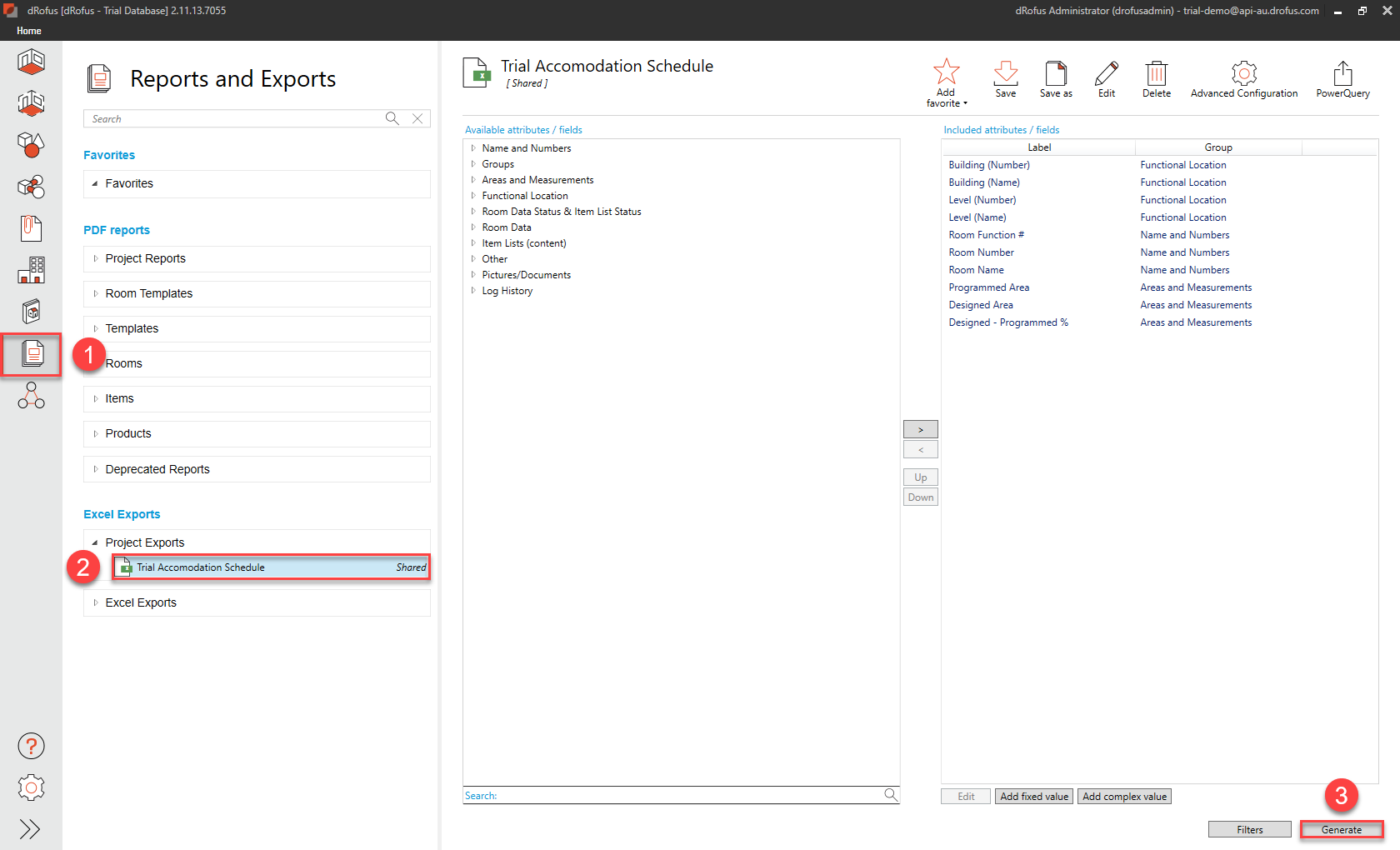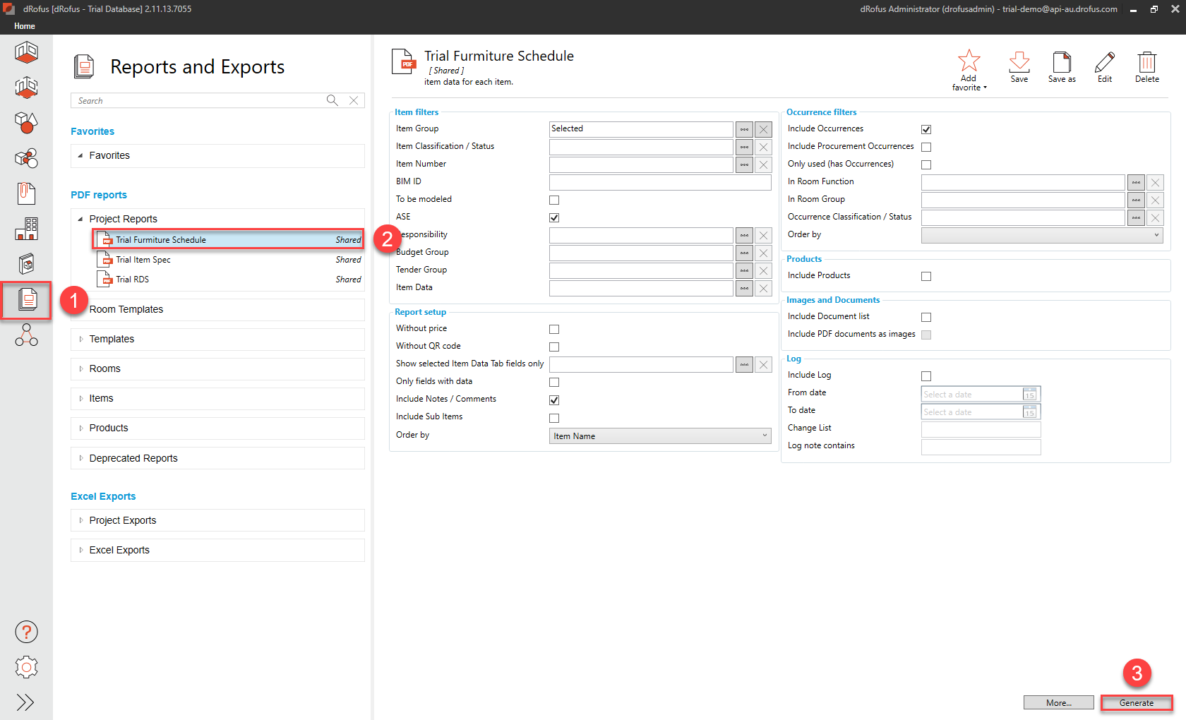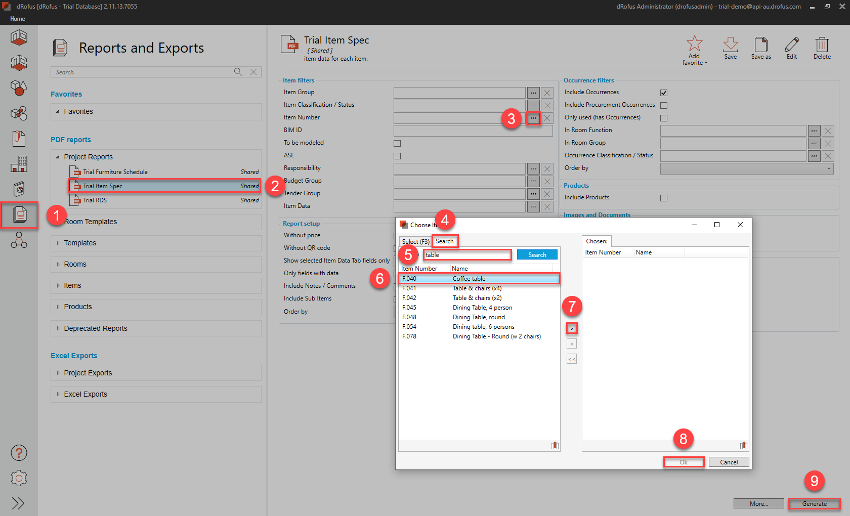 d. Back in dRofus App - Generate the PDF Report called “Trial Item Spec” (ensuring that the highlighted selections are made in the following sequence of steps):