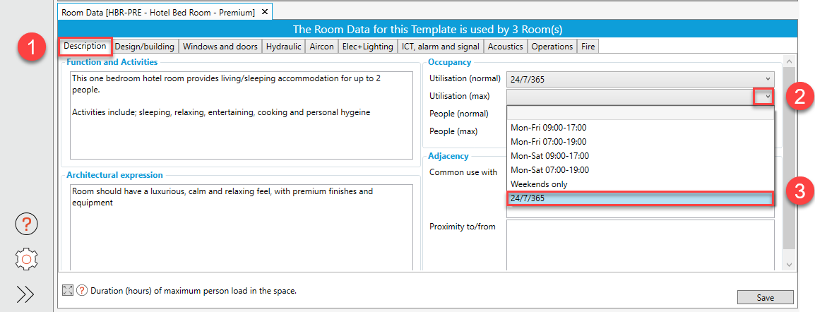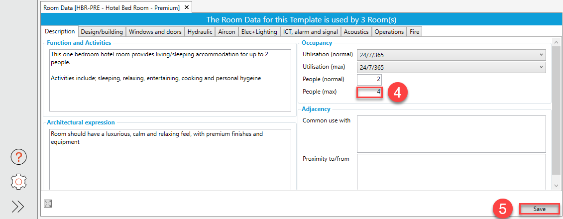 c. Within the Flag called “Description”, edit some Room Data, for example, “Utilisation (max)” and “People (max)”, and then hit “Save”: