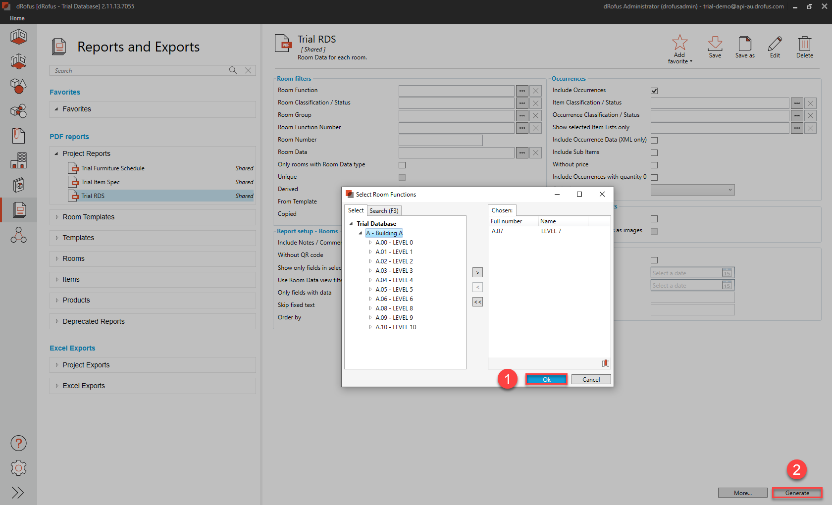 e. Generate the PDF Report called “Trial RDS” (ensuring that the highlighted selections are made in the following sequence of steps):