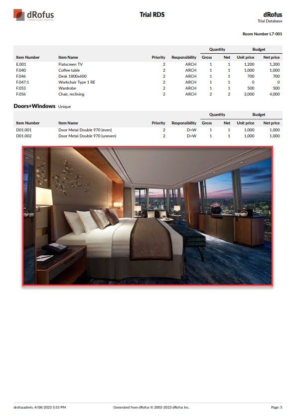 d. Note that some of the FF&E, Doors + Windows, and Services Statuses of some of the Rooms now have a definition (i.e., their Statuses are “Unique”). If you then select the first Room (i.e., “PREMIUM BED 1”), note within the Items in Room Panel, the Occurrences that have just been updated from the Revit model: