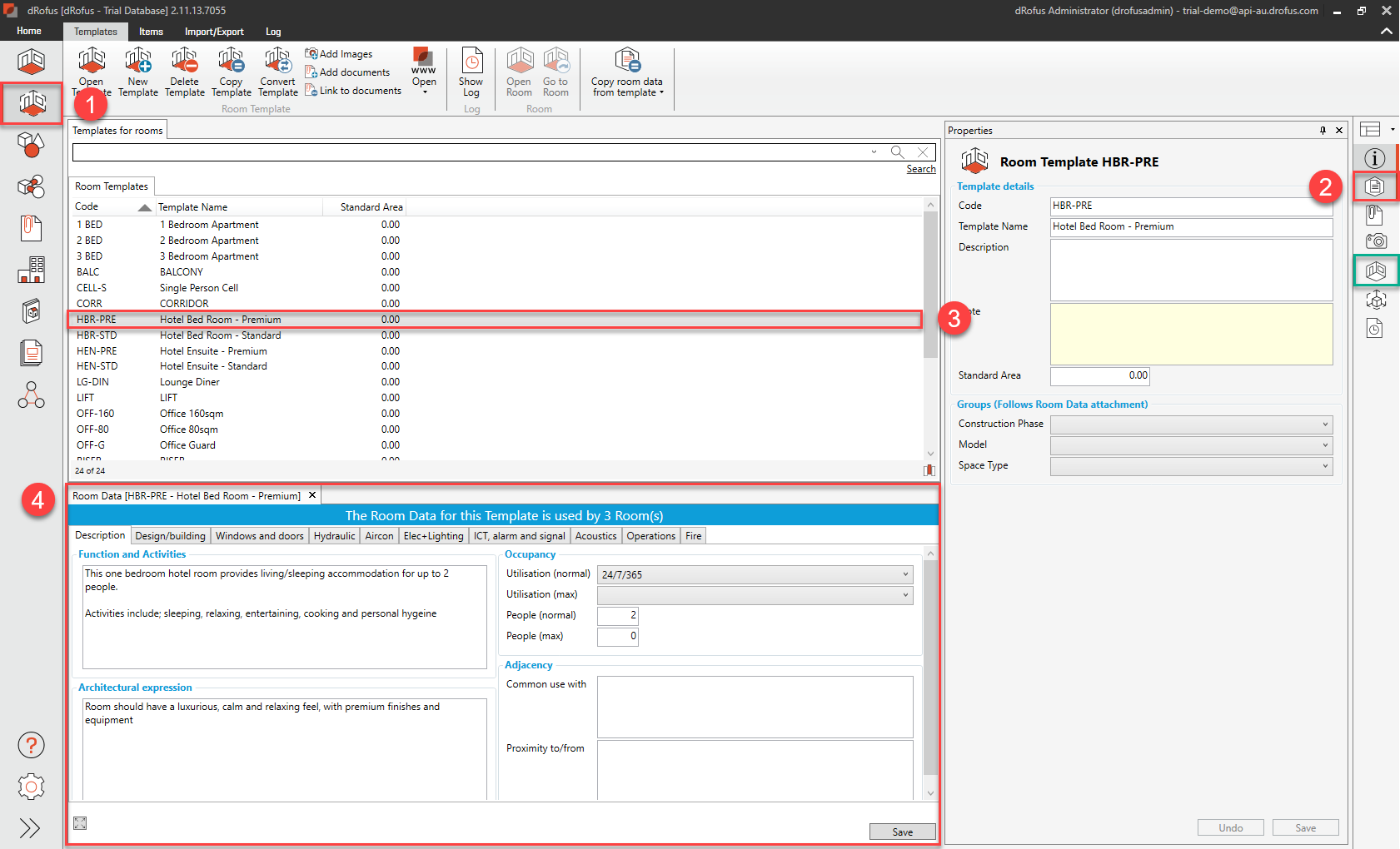 b. Go to the Room Templates Module, activate the Room Data Panel, select the Room Template called “HBR-PRE - Hotel Bed Room - Premium”, and then view the data for this Room Template: