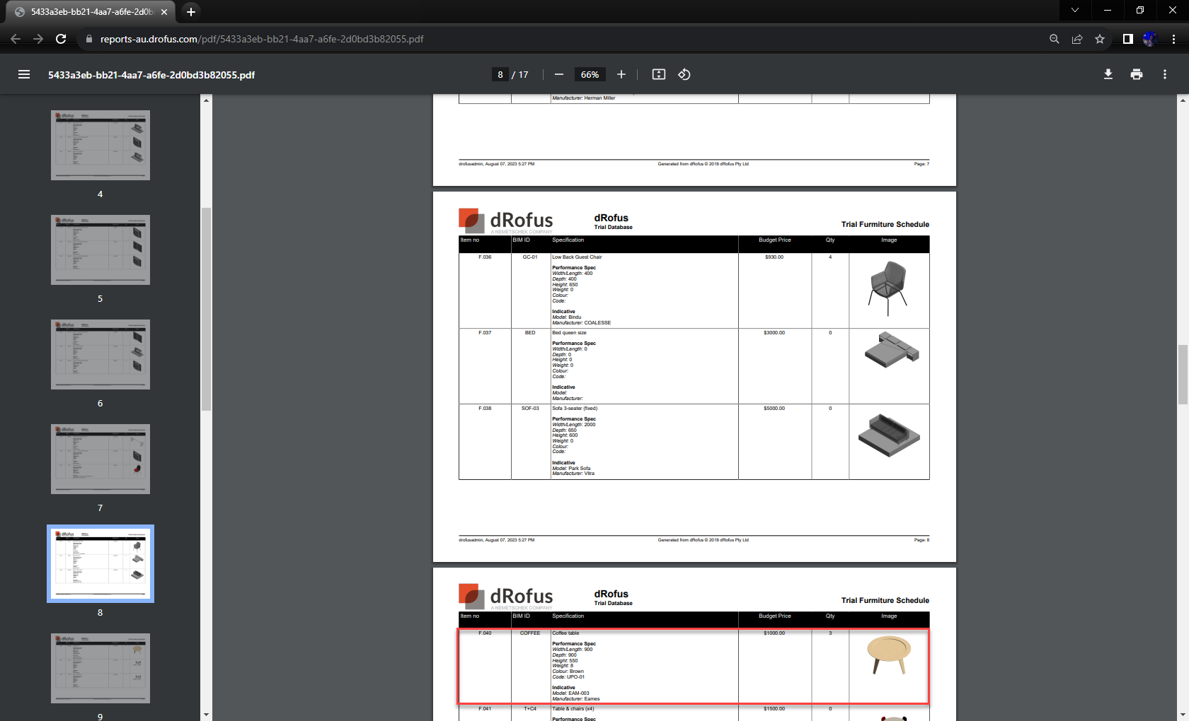 f. Generate the PDF Report called “Trial Furniture Schedule” (ensuring that the highlighted selections are made in the following sequence of steps):