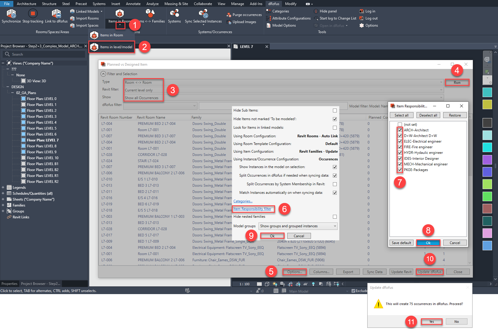 b. Update Occurrences in dRofus based on the Revit model (ensuring that the highlighted selections are made in the following sequence of steps):
