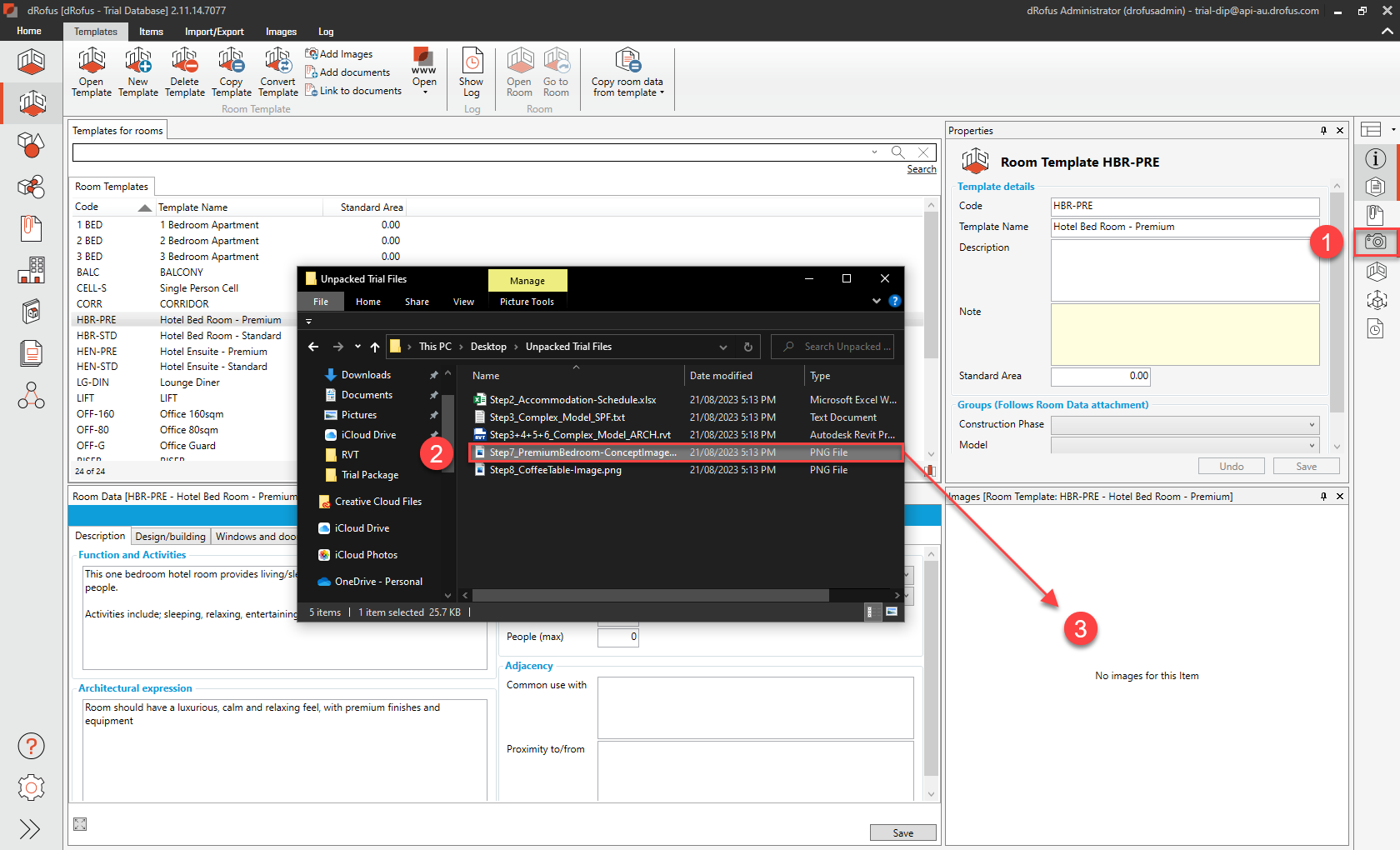 d. Activate the Images Panel, then from your Windows Explorer (or similar), drag and drop to upload image “Step7_PremiumBedroom-ConceptImage.png” as follows: