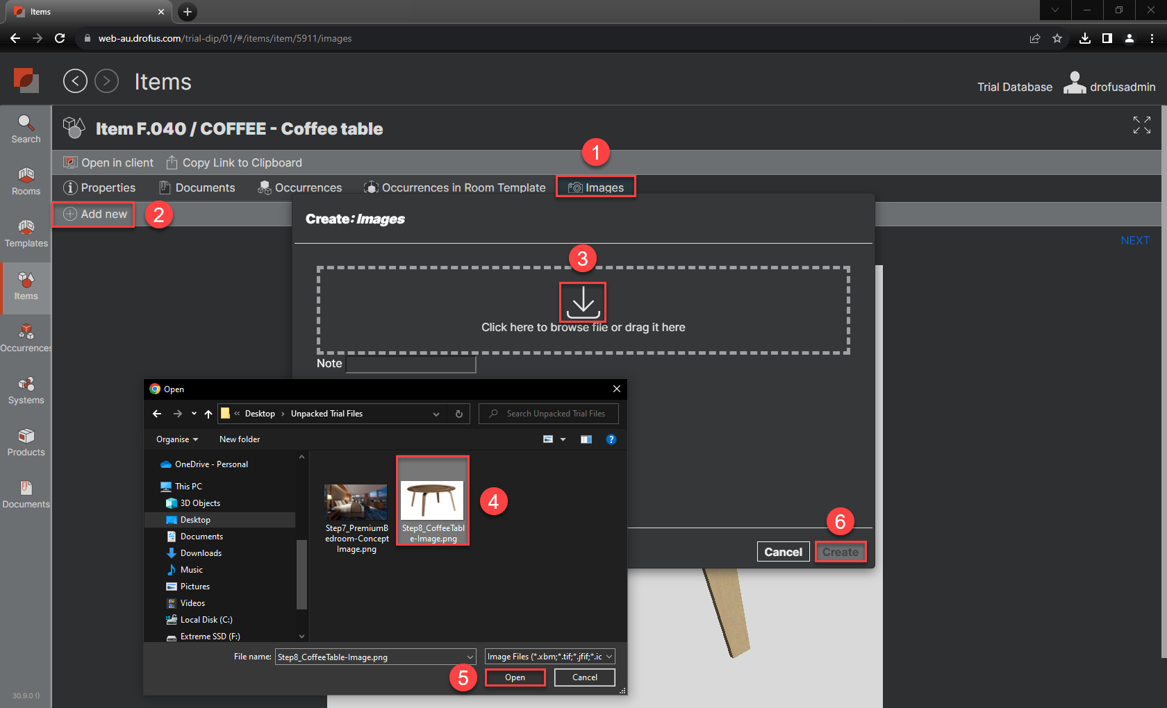 b. Log in to dRofus Web within your web browser, go to Images, then Add new, then browse file to upload image “Step8_CoffeeTable-Image.png” as follows: