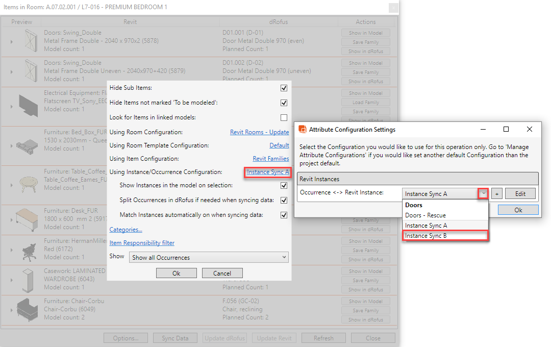 Once Items have been matched / linked (as described in the previous section) data can then be synchronized between Family Instance Parameters in Revit and Item Occurrence Attributes in dRofus.