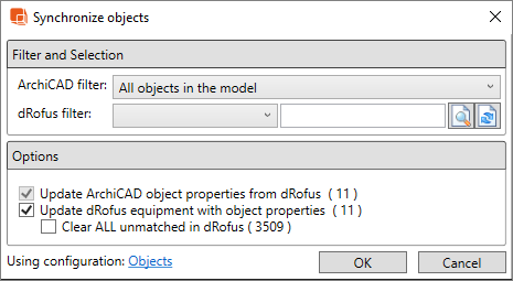 Update dRofus equipment with object properties Allows you to update dRofus Items with the latest data from the corresponding (linked) ArchiCAD Objectsas per the Default / Active Attribute Configuration for Objects <-> Items. This only applies to linked Objects <-> Items. In brackets you will see the count of dRofus Items that will be synchronized with ArchiCAD Objects. Items that are not linked will not be included in this count.