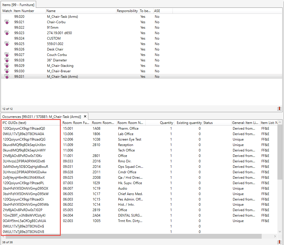 The IFC Guid’s can be viewed in all lists showing occurrences. Use the Add/Remove column option to add it to the list view. In the image below we show a list of occurrences in the Item module that have been imported from IFC, with the IFC Guid column shown.