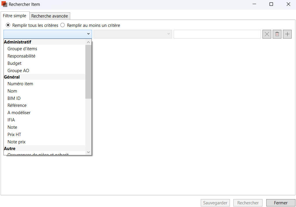 Ce que vous pouvez rechercher est déterminé par le module à partir duquel vous ouvrez la boîte de dialogue de recherche. Si, par exemple, vous ouvrez une recherche à partir du module Items, toutes les propriétés et spécifications des Items s'afficheront dans la liste des attributs.