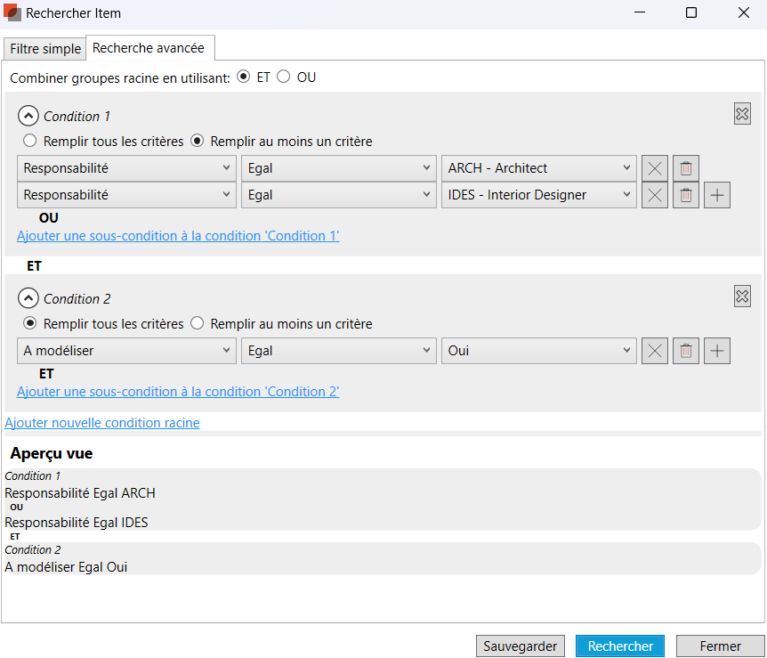 Exemple : Trouver tous les items qui sont définis comme "à modéliser" et dont la Responsabilité est ARCH (architecte) et/ou IDES (architecte d'intérieur).