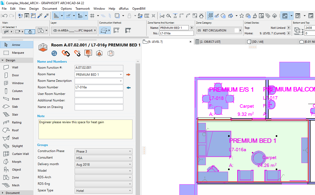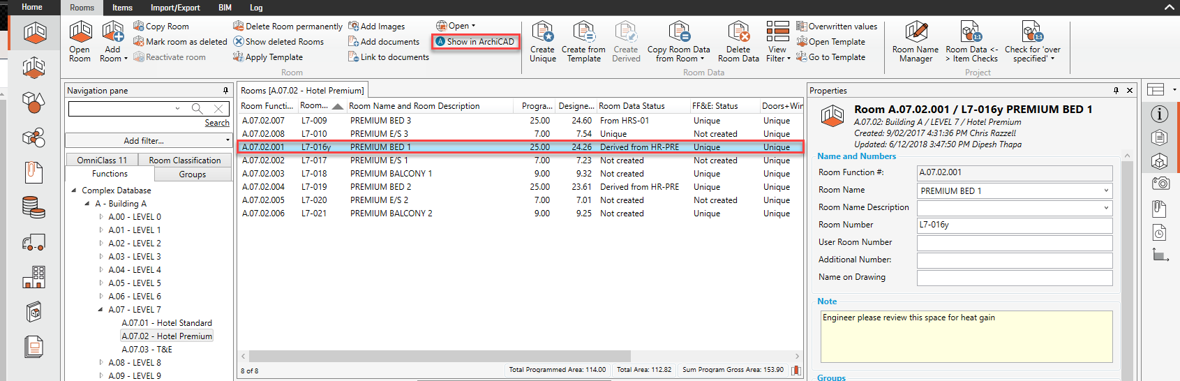 Si une pièce dans dRofus est sélectionnée (qui est déjà liée à une zone correspondante dans ArchiCAD), et que vous cliquez sur "Afficher dans ArchiCAD" (voir ci-dessous):