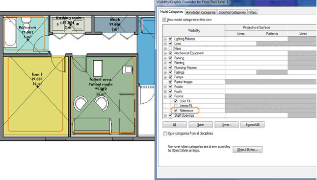 En travaillant avec le plug-in, il est très probable que vous travailliez avec les pièces, ce qui signifie que vous devez sélectionner un objet de pièce pour accéder aux données comme les paramètres de la pièce, les équipements, etc. Un moyen d'accéder facilement à l'objet de pièce dans la maquette consiste à activer Référence de Pièce. Ouvrir les Raccourcis de Visibilité/Graphiques (raccourci-clavier "v"+"g")->Ouvrir les Pièces->Activer "Référence".