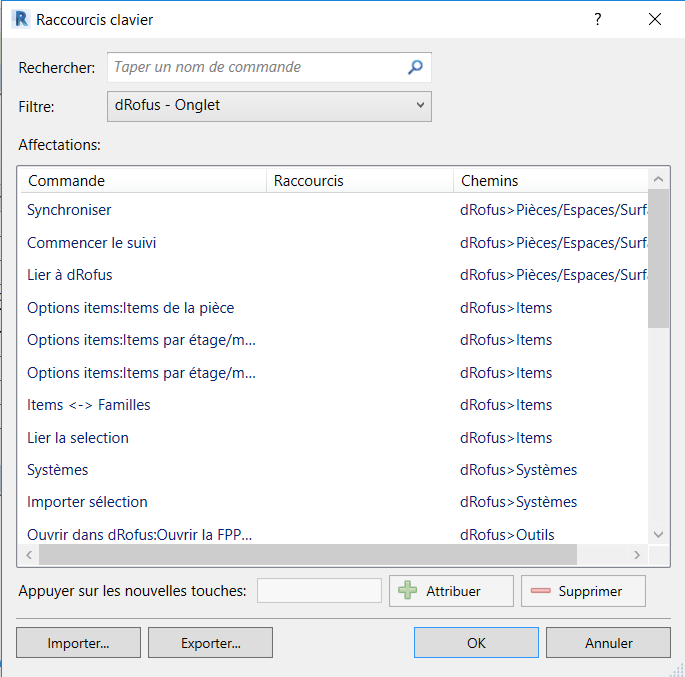 Sous Revit, vous pouvez créer et contrôler vos propres raccourcis-clavier. Si, par exemple, vous utilisez la commande "Items dans la pièce", vous pouvez ouvrir cette fenêtre avec un raccourci-clavier personnel défini. Allez à Vue->interface Utilisateur->Raccourcis-clavier. Recherchez la commande pour laquelle vous voulez créer un raccourci-clavier pour, par exemple, la fenêtre FF & E. Dans "Appuyer sur de nouvelles touches", insérez le raccourci-clavier que vous voulez affecter à la commande, puis appuyez sur "Affecter";