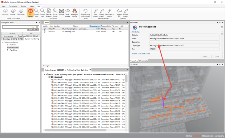 Comme indiqué dans les chapitres précédents, le GUID sera capturé dans dRofus dans le cadre de la synchronisation sur la maquette. En vous connectant à une maquette IFC dans dRofus, vous pourrez obtenir une visualisation graphique des réseaux et terminaux dans dRofus.