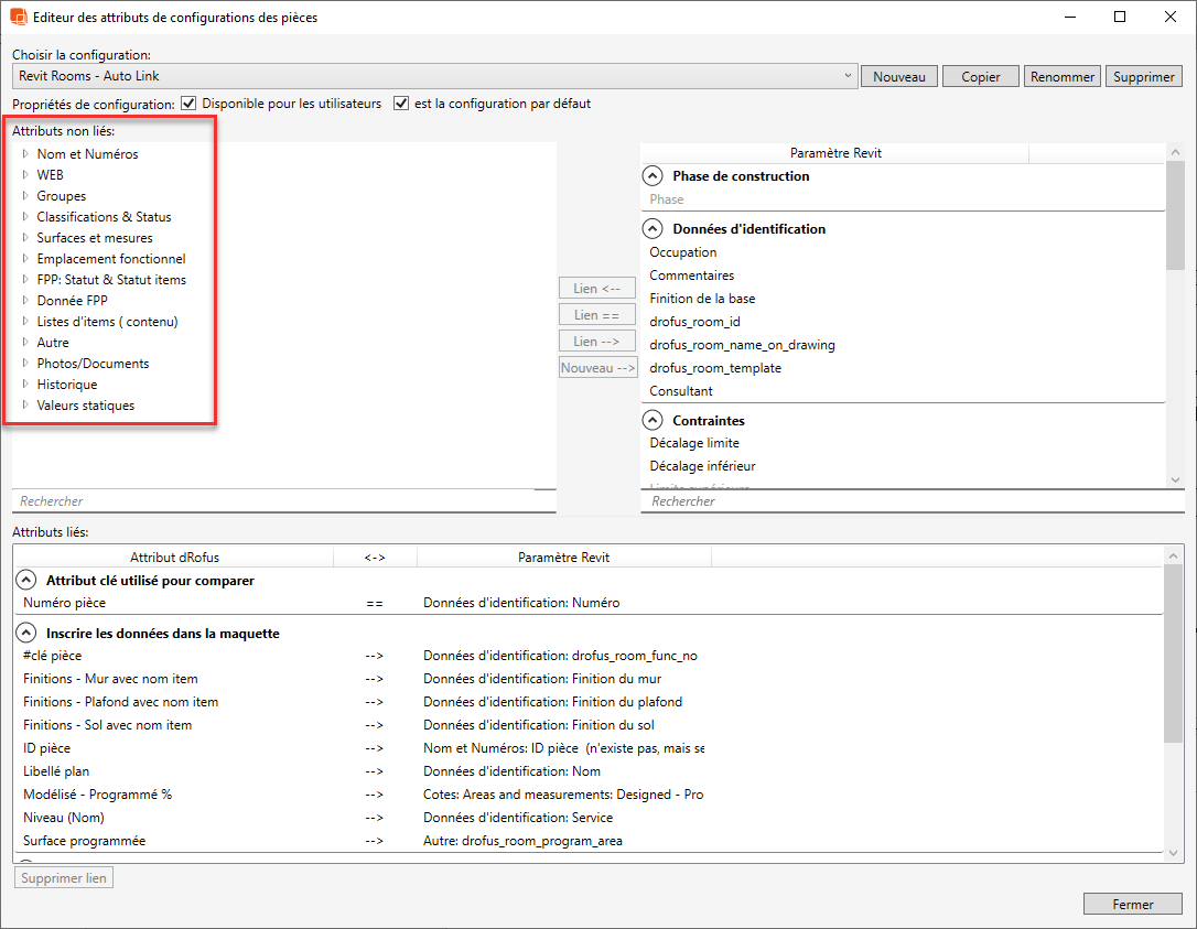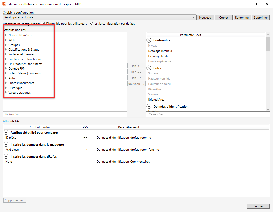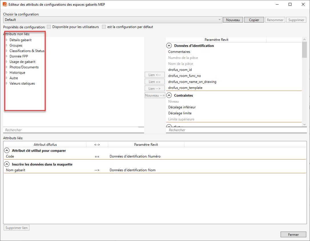 Dans la section supérieure gauche de l'éditeur de configuration des attributs, les attributs dRofus disponibles sont classés différemment pour chaque type de configuration, comme suit :
