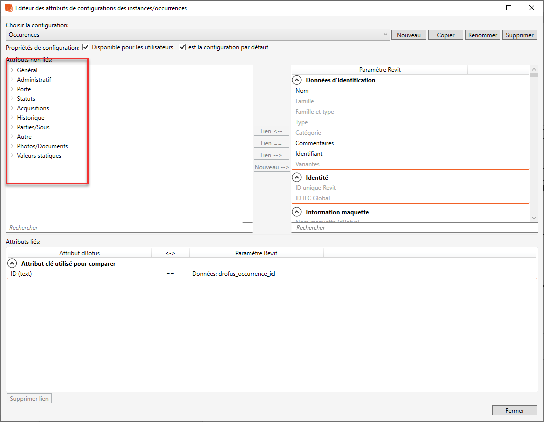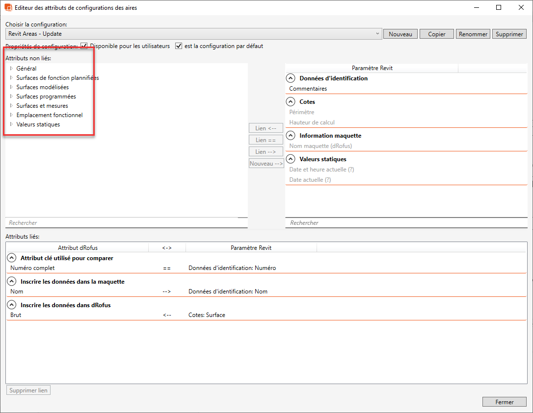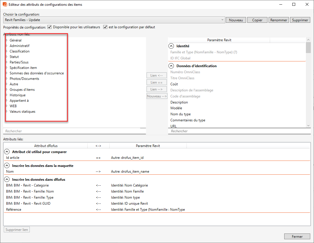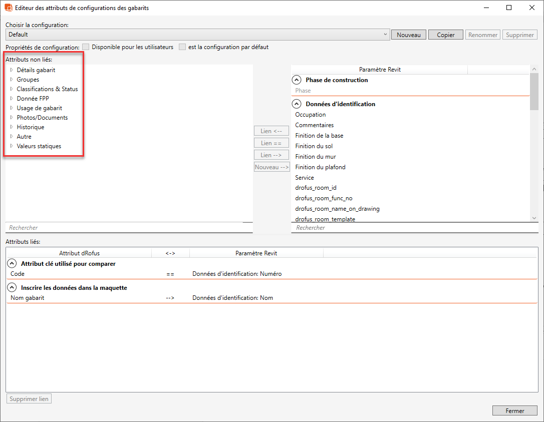Dans la section supérieure gauche de l'éditeur de configuration des attributs, les attributs dRofus disponibles sont classés différemment pour chaque type de configuration, comme suit :