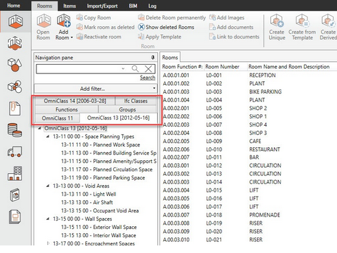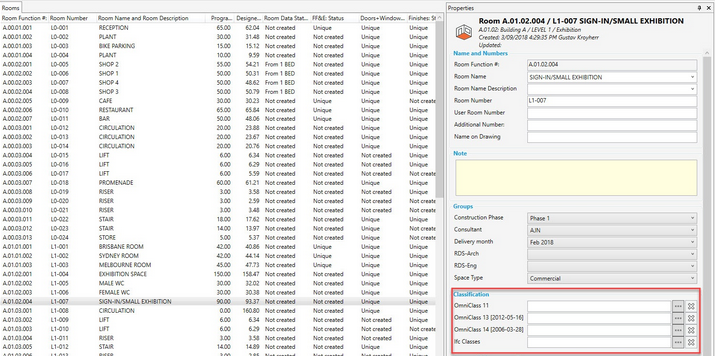 Un ou plusieurs systèmes de classification (tels que OmniClass, Masterformat, Uniclass ou Ifc) peuvent être affectés à des pièces indépendamment de leur emplacement fonctionnel.