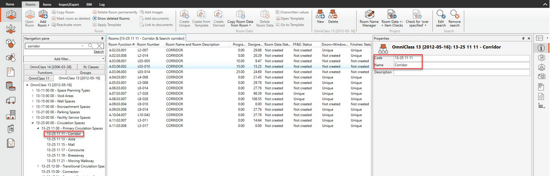 Les classifications peuvent être appliquées en tant que filtres dans le module de rapports. Par exemple, vous voudrez peut-être exécuter un rapport de données de salle pour tous les OmniClass 13-25 11 11 - Principaux espaces de circulation.