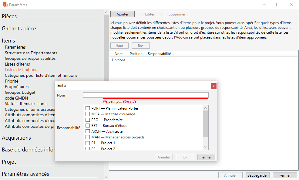 Sélectionner "Ajouter" et donner un nom à la liste de finitions, par ex. "Finitions". Dans la liste ci-dessous, vous pouvez voir tous les groupes de responsabilités créés dans la base de données. Ces groupes peuvent être utilisés pour déterminer quels items devront être autorisés à être ajoutés à la liste des finitions. Si vous sélectionnez par ex. 'ARC', seuls les items ayant comme responsabilité 'ARC' seront admis à être ajoutés à la liste. Pour tous renseignements complémentaires sur les groupes de responsabilités et l'accès des utilisateurs, voir la notice d'administration dRofus, l'Administrateur de projets.